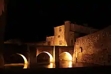 La tour est reliée au logis, lui-même fortifié, par un pont à trois arches.
