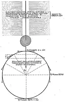 Tesla calcule que le temps aller-retour de l'onde du courant électrique est de 0,08484 seconde, ce qui correspond à une vitesse de propagation constante à la vitesse de la lumière sur l'axe tour/point de réflexion, mais à une vitesse moyenne de l'onde de 471 240 km/s à la surface de la Terre, plus vite que la vitesse de la lumière[Br2 1]. En effet, pour que le front d'onde soit toujours des disques perpendiculaires, il est nécessaire qu'il se propage plus vite à la surface que sur l'axe : selon Tesla, la propagation de l'onde à travers la Terre est semblable au passage de l'ombre de la Lune sur la Terre lors d'une éclipse solaire : l'ombre se déplace dans l'espace à vitesse constante, mais la vitesse à la surface de la Terre de l'ombre est infinie au point où l'ombre atteint la Terre, est minimale à l'équateur, et réaccélère pour redevenir infinie au point opposé (voir figure ci-contre)[FSI 1].