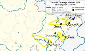 Cette édition se déroule en six étapes. La première étape est plate et courue autour d'Altenbourg. La deuxième autour de Gera. La troisième, plus vallonnée, se dispute autour de Schleiz. Un contre-la-montre individuel a ensuite lieu à Triebes. Il escalade la côte de Dörtendorf plus connu sous le nom Hankaberg[1]. La cinquième étape se court à Schmölln. Enfin la dernière étape à Greiz[2].