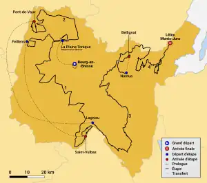 | Prologue | 11 août | Bourg-en-Bresse – Bourg-en-Bresse | contre-la-montre individuel | 3,8 | ||