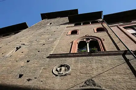 Des trous sont visibles sur la façade de la tour, certains sont des trous remontant au chantier de construction, tandis que d'autres ont été utilisés pour ancrer des escaliers et étages utiles pour relier la tour à d'autres structures externes[4].