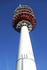 Vue en contre-plongée. On notera la présence d'antennes-relais GSM à la base de la tour.