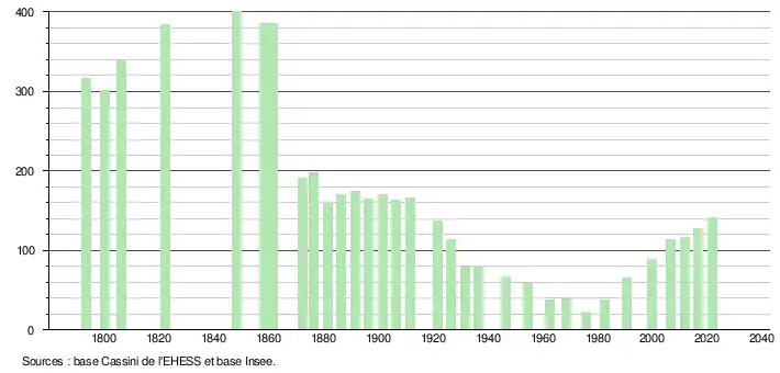 L'évolution du nombre d'habitants est connue à travers les recensements de la population effectués dans la commune depuis 1793. Pour les communes de moins de 10 000 habitants, une enquête de recensement portant sur toute la population est réalisée tous les cinq ans, les populations légales des années intermédiaires étant quant à elles estimées par interpolation ou extrapolation[25]. Pour la commune, le premier recensement exhaustif entrant dans le cadre du nouveau dispositif a été réalisé en 2006[26].