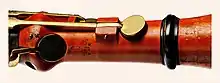Historiquement l'invention des clés d'extension est attribuée à la famille Hotteterre de La Couture-Boussey vers , elles sont d'abord activées par l'auriculaire de la main inférieure gauche ou droite (extension de l'ambitus vers le registre grave) et étaient fixés avec un montage transversal dans l'encoche d'un anneau extérieur réalisé par le tourneur sur le corps de l'instrument de musique avec un fil de cuivre comme axe de rotation[1],[2]. Les premières clés ont permis d'atteindre des nouveaux trous percés en aval ou en amont des 8 trous accessibles comme sur le corps d'une flûte à bec ordinaire.