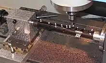 - des vis (3) maintenant les clefs en bout d'axe, également vissées sur des tourillons. Il s'agit de « clefs à tringle » dont l'axe est plein et percée à chaque extrémité pour recevoir les pointes de vis[4]. Cette solution offre une grande réduction des frottements donc une plus grande vélocité à l'instrument. Elle est surtout moins encombrante, mais ne permet pas l'alignement de plusieurs clés. Seulement là aussi, pour les pièces de grande longueur la maîtrise du jeu mécanique est délicate.