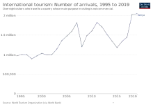 Le nombre de touristes atteint un pic à 1,8 million de visiteurs en 2011 avant de diminuer en raison d'attaques terroristes en 2013, en particulier l'attaque terroriste du centre commercial Westgate, qui entraîne des restrictions de voyage et des craintes de la part des touristes, notamment en provenance d'Angleterre[8]. 1,49 million de touristes internationaux arrivent en effet au Kenya cette année-là[9]. Malgré les avis déconseillant le pays aux touristes pendant la période électorale, les arrivées de touristes au Kenya passent de 72 573 en novembre 2017 à 105 862 en décembre. 82000 touristes arrivent en moyenne chaque mois de 2006 à 2017[réf. nécessaire].