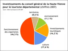 Le montant des investissements du conseil général pour le tourisme départemental s'est élevé à 3 931 000 €, en se répartissant comme suit (en milliers d'euros)[1] :
