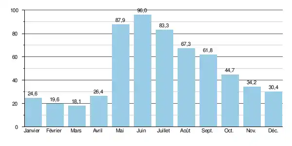 En ce qui concerne la période estivale, libre de glaces (de juin à octobre inclus), le débit mensuel minimal observé a été de 20,2 m3/s en , ce qui restait presque abondant.
