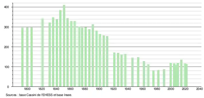 L'évolution du nombre d'habitants est connue à travers les recensements de la population effectués dans la commune depuis 1793. Pour les communes de moins de 10 000 habitants, une enquête de recensement portant sur toute la population est réalisée tous les cinq ans, les populations légales des années intermédiaires étant quant à elles estimées par interpolation ou extrapolation[17]. Pour la commune, le premier recensement exhaustif entrant dans le cadre du nouveau dispositif a été réalisé en 2004[18].