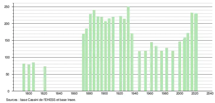 L'évolution du nombre d'habitants est connue à travers les recensements de la population effectués dans la commune depuis 1793. Pour les communes de moins de 10 000 habitants, une enquête de recensement portant sur toute la population est réalisée tous les cinq ans, les populations légales des années intermédiaires étant quant à elles estimées par interpolation ou extrapolation[18]. Pour la commune, le premier recensement exhaustif entrant dans le cadre du nouveau dispositif a été réalisé en 2005[19].
