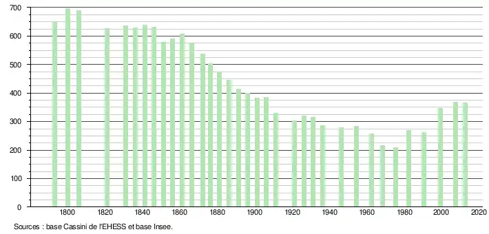 L'évolution du nombre d'habitants est connue à travers les recensements de la population effectués dans la commune depuis 1793. À partir du , les populations légales des communes sont publiées annuellement dans le cadre d'un recensement qui repose désormais sur une collecte d'information annuelle, concernant successivement tous les territoires communaux au cours d'une période de cinq ans. Pour les communes de moins de 10 000 habitants, une enquête de recensement portant sur toute la population est réalisée tous les cinq ans, les populations légales des années intermédiaires étant quant à elles estimées par interpolation ou extrapolation[11]. Pour la commune, le premier recensement exhaustif entrant dans le cadre du nouveau dispositif a été réalisé en 2007[12],[Note 2].