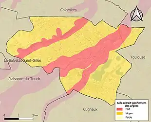 Le retrait-gonflement des sols argileux est susceptible d'engendrer des dommages importants aux bâtiments en cas d’alternance de périodes de sécheresse et de pluie. La totalité de la commune est en aléa moyen ou fort (88,8 % au niveau départemental et 48,5 % au niveau national). Sur les 8 155 bâtiments dénombrés sur la commune en 2019, 8 155 sont en aléa moyen ou fort, soit 100 %, à comparer aux 98 % au niveau départemental et 54 % au niveau national. Une cartographie de l'exposition du territoire national au retrait gonflement des sols argileux est disponible sur le site du BRGM[27],[Carte 3].