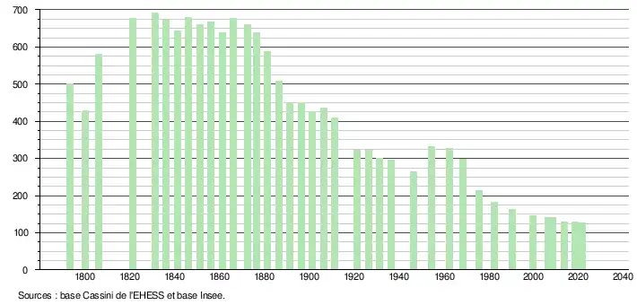 L'évolution du nombre d'habitants est connue à travers les recensements de la population effectués dans la commune depuis 1793. Pour les communes de moins de 10 000 habitants, une enquête de recensement portant sur toute la population est réalisée tous les cinq ans, les populations légales des années intermédiaires étant quant à elles estimées par interpolation ou extrapolation[15]. Pour la commune, le premier recensement exhaustif entrant dans le cadre du nouveau dispositif a été réalisé en 2008[16].