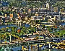 Nous avons traversé les rivières Monongahela et Allegheny jusqu'au centre-ville de Pittsburgh sur ces ponts. J'ai pris la photo du mont .Washington.