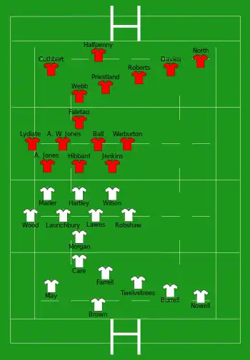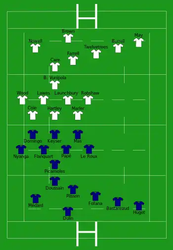 - Angleterre : 2 essais de Care (4e) et Burrell (33e) ; 2 transformations de Farrell (5e, 34e) ; 5 pénalités de Farrell (18e, 26e, 45e, 54e, 58e)