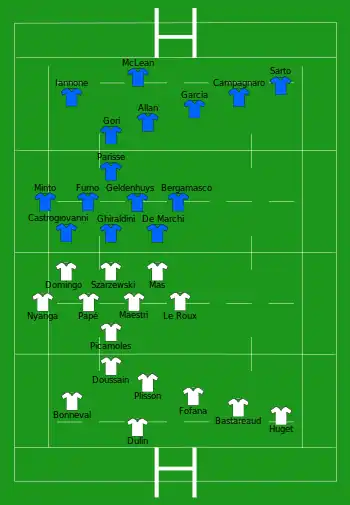 - Italie : 2 essai de Allan (40e) et Furno (70e) ; 2 transformations de Allan (40e) et Orquera (72e) ; 2 pénalités de Allan (14e, 32e)