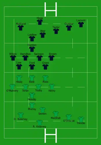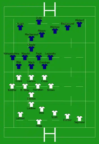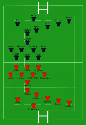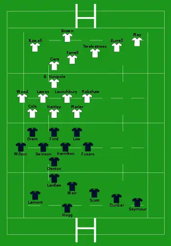- Écosse : 2 essais de Hogg (12e) et Seymour (22e) ; 2 transformations de Laidlaw (13e, 23e) ; 1 pénalité de Weir (61e)
