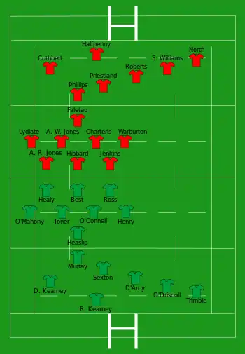 - Irlande : 7 essais de Sexton (6e, 60e), Trimble (38e), Healy (53e), Cronin (69e), McFadden (77e) et McGrath (80e) ; 4 transformations de Sexton (6e, 39e) et Jackson (69e, 77e) ; 1 pénalité de Sexton (32e)