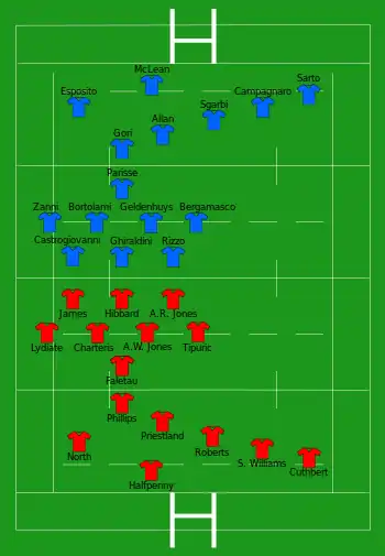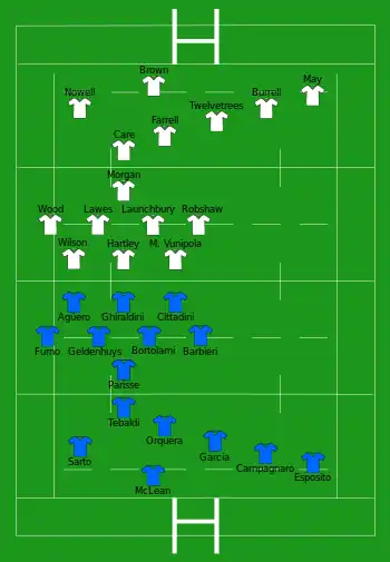 - Italie : 1 essai de Sarto (24e) ; 1 transformation de Orquera (25e)