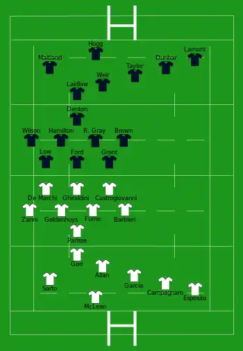 - Écosse : 2 essai de Dunbar (54e, 68e) ; 1 transformation de Weir (68e) ; 2 pénalités de Laidlaw (23e, 45e) ; 1 drop de Weir (80e)