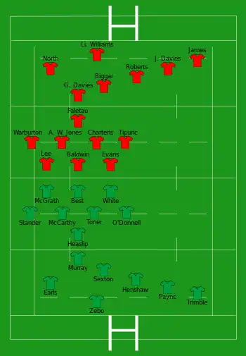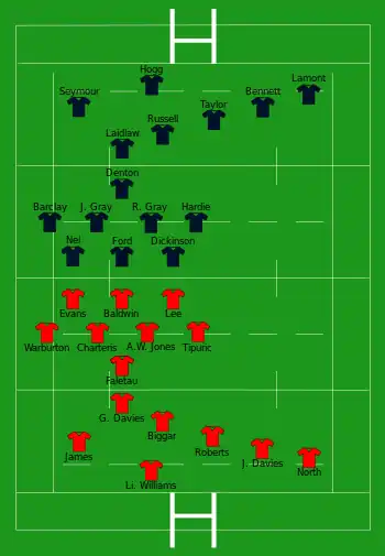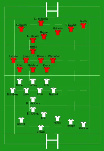 - 9 essais : Webb 4e, Biggar 28e, J. Davies 32e, Roberts 44e, North 48e, Williams 56e, Moriarty 64e, 78e, G. Davies 80e