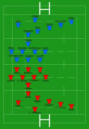 Rapidement dans cette rencontre, les Gallois prennent l'avantage grâce à un essai en force de Webb à la suite d'une touche. Biggar passe la transformation, (7-0) à la 5e minute. Même si les Italiens tentent de réagir, ils sont punis par leur indiscipline, Biggar passant deux pénalités, (13-0) à la 20e. Ce dernier marque le deuxième essai du match à la suite d'une percée au centre du terrain, (20-0) à la 28e minute. Dans la foulée, les Gallois effectue une remontée de ballon sur 80 mètres, l'action est conclue par un essai de J. Davies, transformé par Biggar, (27-0) score à la mi-temps.