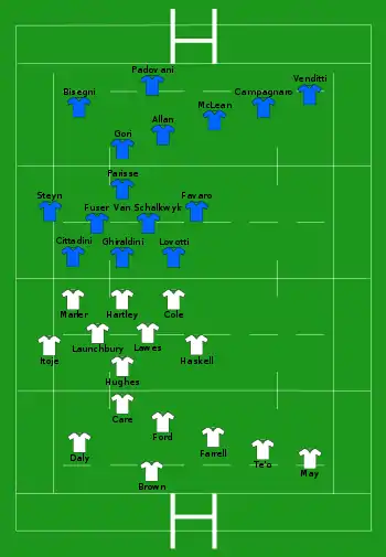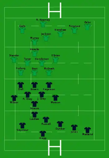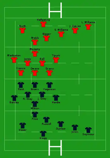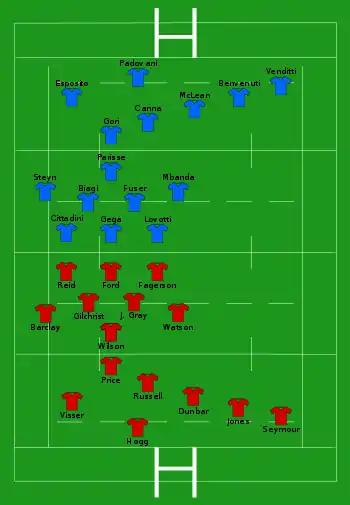 - Écosse : 4 essais de Russell (28e), Scott (38e), Visser (62e) et Seymour (73e) ; 3 transformations de Russell (29e, 63e, 74e) ; 1 pénalité de Hogg (6e)