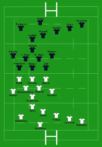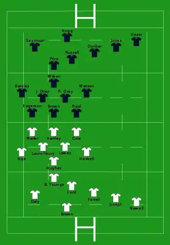 - Écosse : 3 essais de Reid (29e), Jones (50e, 69e) ; 3 transformations de Russell (30e, 51e, 70e)