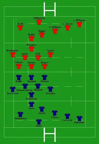 - France : 2 essais de Lamerat (7e) et Chouly (80e+20) ; 2 transformations de Lopez (8e, 80e+21) ; 2 pénalités de Lopez (16e, 67e)