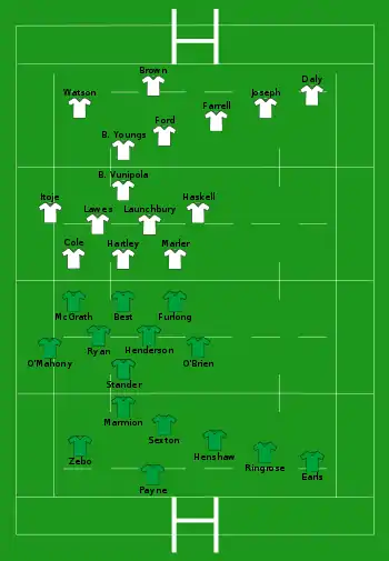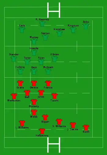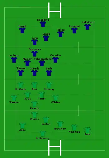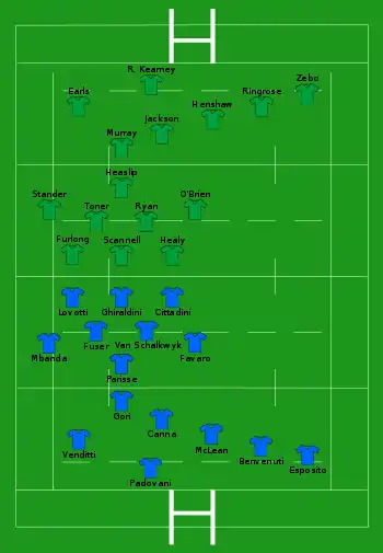 - Irlande : 1 essai de Henderson (24e) ; 1 transformation de Sexton (24e) ; 2 pénalité de Sexton (9e, 61e)