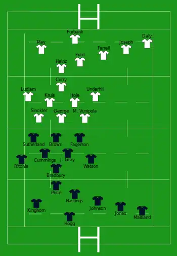 - 5 essais de Youngs (6e, 42e), George (52e), Curry (68e), Slade (73e)