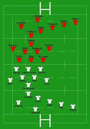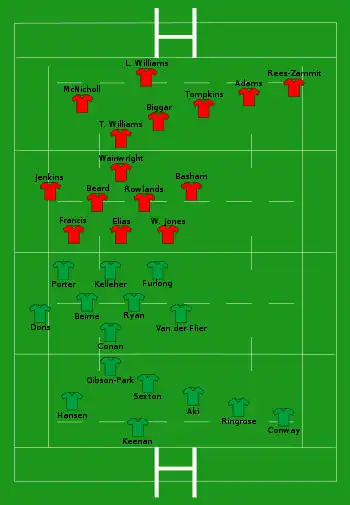 Arbitre :Le pays de Galles ne compte encore qu'une seule victoire dans le Tournoi, et accueille la France qui, elle, est encore la seule équipe en lice pour le Grand Chelem. Le début de match est favorable aux Français, qui, après une pénalité de part et d'autre, marquent le premier essai du match. Jouant un surnombre côté gauche, Jelonch, idéalement placé sur l'aile marque son deuxième essai en sélection. Transformé, les visiteurs mènent 3-10, mais concèdent deux pénalités et regagnent les vestiaires avec un petit point d'avance seulement, sur le score de 9-10.