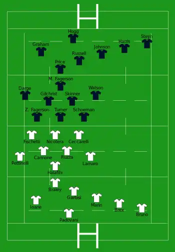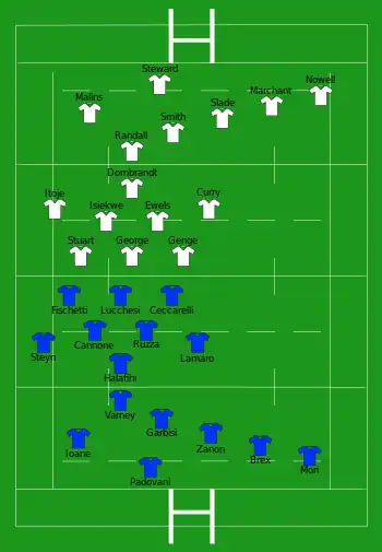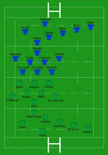 - 5 pénalités de Garbisi (12e, 32e, 57e) et Padovani (16e, 34e)
