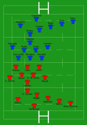 À une minute de la fin du match, les joueurs du pays de Galles dégagent un ballon dangereux et permettent une ultime offensive italienne. Ange Capuozzo tente une relance en inversant la course et perce entre deux défenseurs gallois. D'un magnifique cadrage-débordement, il mystifie son vis-à-vis, avant de parfaitement jouer le deux contre un coté intérieur, offrant l'essai de la gagne à Eduardo Padovani. Aplati entre les poteaux, l'essai est transformé et permet aux Italiens de s'imposer sur le fil à la sirène sur le score de 21-22.