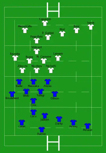 Pour préparer la troisième journée, Simone Ferrari, Louis Lynagh, François Carlo Mey sont convoqués tandis que Tommaso Allan a demandé à ne pas être sélectionné pour pouvoir se reposer. De plus, Pietro Ceccarelli, Edoardo Iachizzi, Lorenzo Cannone et Sebastian Negri sont forfaits pour cette rencontre[43],[44]. Cependant, quelques jours plus tard, François Carlo Mey est contraint de déclarer forfait, il est remplacé par Giovanni Licata[45]. Le , c'est au tour de Matteo Nocera (en) de déclarer forfait pour ce troisième match, il est remplacé par Filippo Alongi (en)[46].