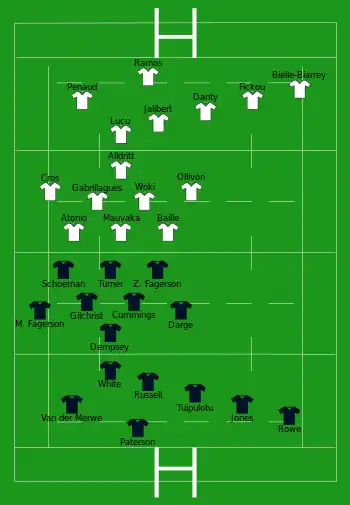 Le , pour préparer la troisième journée, Marko Gazzotti est convoqué pour la première fois à la suite du forfait de Grégory Alldritt, Charles Ollivon est donc le capitaine en son absence, Romain Taofifénua fait également son retour dans le groupe[27]. Le lendemain, Gaëtan Barlot déclare forfait, il est remplacé par Maxime Lamothe[28].