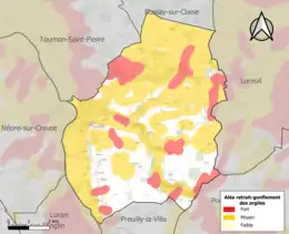 Le retrait-gonflement des sols argileux est susceptible d'engendrer des dommages importants aux bâtiments en cas d’alternance de périodes de sécheresse et de pluie. 71,2 % de la superficie communale est en aléa moyen ou fort (84,7 % au niveau départemental et 48,5 % au niveau national). Sur les 748 bâtiments dénombrés sur la commune en 2019, 631 sont en aléa moyen ou fort, soit 84 %, à comparer aux 86 % au niveau départemental et 54 % au niveau national. Une cartographie de l'exposition du territoire national au retrait gonflement des sols argileux est disponible sur le site du BRGM[23],[24].