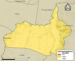Le retrait-gonflement des sols argileux est susceptible d'engendrer des dommages importants aux bâtiments en cas d’alternance de périodes de sécheresse et de pluie. La totalité de la commune est en aléa moyen ou fort (44,5 % au niveau départemental et 48,5 % au niveau national). Sur les 40 bâtiments dénombrés sur la commune en 2019, 40 sont en aléa moyen ou fort, soit 100 %, à comparer aux 75 % au niveau départemental et 54 % au niveau national. Une cartographie de l'exposition du territoire national au retrait gonflement des sols argileux est disponible sur le site du BRGM[34],[Carte 3].