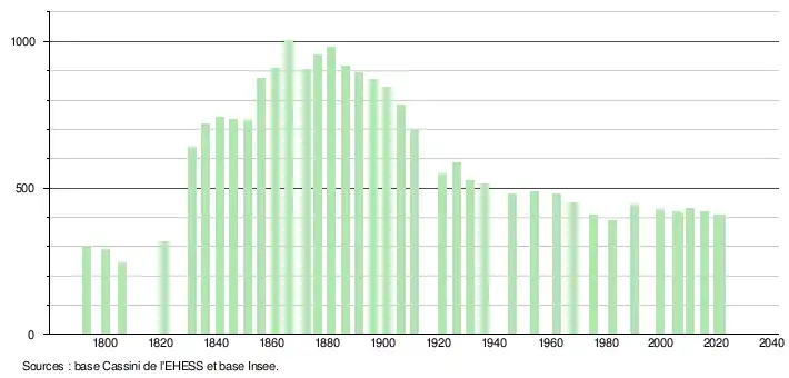 L'évolution du nombre d'habitants est connue à travers les recensements de la population effectués dans la commune depuis 1793. Pour les communes de moins de 10 000 habitants, une enquête de recensement portant sur toute la population est réalisée tous les cinq ans, les populations légales des années intermédiaires étant quant à elles estimées par interpolation ou extrapolation[17]. Pour la commune, le premier recensement exhaustif entrant dans le cadre du nouveau dispositif a été réalisé en 2005[18].