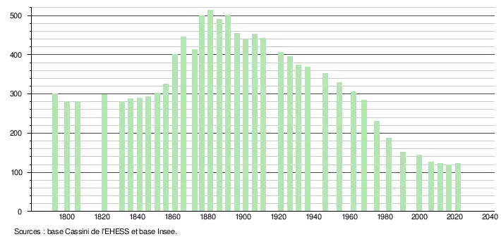 L'évolution du nombre d'habitants est connue à travers les recensements de la population effectués dans la commune depuis 1793. Pour les communes de moins de 10 000 habitants, une enquête de recensement portant sur toute la population est réalisée tous les cinq ans, les populations légales des années intermédiaires étant quant à elles estimées par interpolation ou extrapolation[21]. Pour la commune, le premier recensement exhaustif entrant dans le cadre du nouveau dispositif a été réalisé en 2006[22].