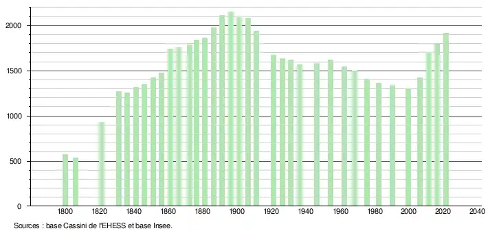 L'évolution du nombre d'habitants est connue à travers les recensements de la population effectués dans la commune depuis 1800. Pour les communes de moins de 10 000 habitants, une enquête de recensement portant sur toute la population est réalisée tous les cinq ans, les populations légales des années intermédiaires étant quant à elles estimées par interpolation ou extrapolation[18]. Pour la commune, le premier recensement exhaustif entrant dans le cadre du nouveau dispositif a été réalisé en 2006[19].