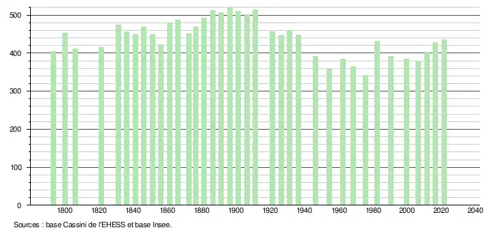 L'évolution du nombre d'habitants est connue à travers les recensements de la population effectués dans la commune depuis 1793. Pour les communes de moins de 10 000 habitants, une enquête de recensement portant sur toute la population est réalisée tous les cinq ans, les populations légales des années intermédiaires étant quant à elles estimées par interpolation ou extrapolation[16]. Pour la commune, le premier recensement exhaustif entrant dans le cadre du nouveau dispositif a été réalisé en 2006[17].