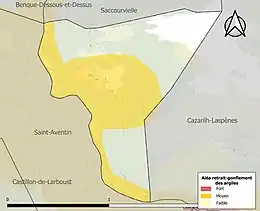 Le retrait-gonflement des sols argileux est susceptible d'engendrer des dommages importants aux bâtiments en cas d’alternance de périodes de sécheresse et de pluie. 46,2 % de la superficie communale est en aléa moyen ou fort (88,8 % au niveau départemental et 48,5 % au niveau national). Sur les 17 bâtiments dénombrés sur la commune en 2019, 16 sont en aléa moyen ou fort, soit 94 %, à comparer aux 98 % au niveau départemental et 54 % au niveau national. Une cartographie de l'exposition du territoire national au retrait gonflement des sols argileux est disponible sur le site du BRGM[29],[Carte 3].