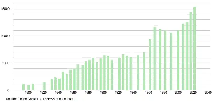 - Par convention dans Wikipédia, le principe a été retenu de n’afficher dans le tableau des recensements et le graphique, pour les populations légales postérieures à 1999, que les populations correspondant à une enquête exhaustive de recensement pour les communes de moins de 10 000 habitants, et que les populations des années 2006, 2011, 2016, etc. pour les communes de plus de 10 000 habitants, ainsi que la dernière population légale publiée par l’Insee pour l'ensemble des communes.