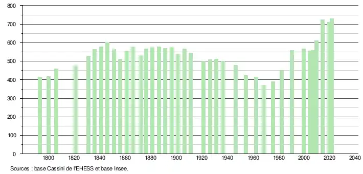 L'évolution du nombre d'habitants est connue à travers les recensements de la population effectués dans la commune depuis 1793. Pour les communes de moins de 10 000 habitants, une enquête de recensement portant sur toute la population est réalisée tous les cinq ans, les populations légales des années intermédiaires étant quant à elles estimées par interpolation ou extrapolation[22]. Pour la commune, le premier recensement exhaustif entrant dans le cadre du nouveau dispositif a été réalisé en 2004[23].