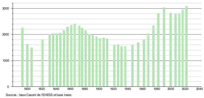 L'évolution du nombre d'habitants est connue à travers les recensements de la population effectués dans la commune depuis 1793. Pour les communes de moins de 10 000 habitants, une enquête de recensement portant sur toute la population est réalisée tous les cinq ans, les populations légales des années intermédiaires étant quant à elles estimées par interpolation ou extrapolation[28]. Pour la commune, le premier recensement exhaustif entrant dans le cadre du nouveau dispositif a été réalisé en 2006[29].
