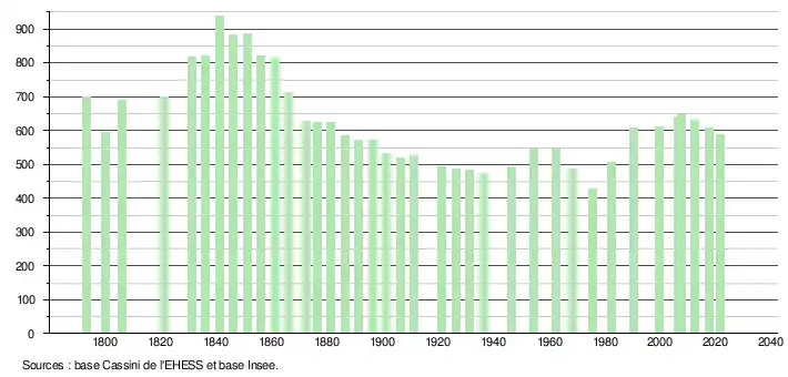 L'évolution du nombre d'habitants est connue à travers les recensements de la population effectués dans la commune depuis 1793. Pour les communes de moins de 10 000 habitants, une enquête de recensement portant sur toute la population est réalisée tous les cinq ans, les populations légales des années intermédiaires étant quant à elles estimées par interpolation ou extrapolation[21]. Pour la commune, le premier recensement exhaustif entrant dans le cadre du nouveau dispositif a été réalisé en 2007[22].