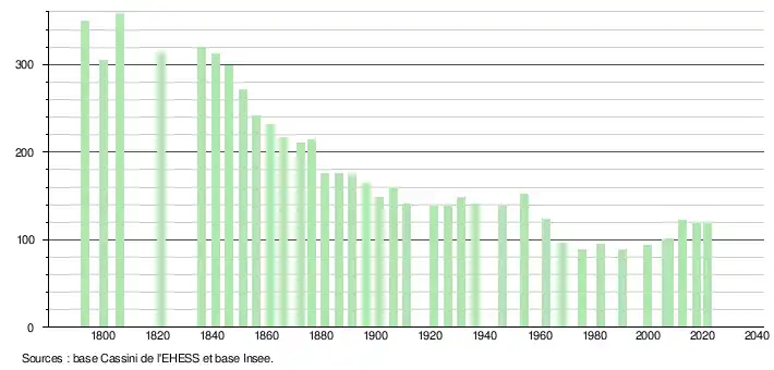 L'évolution du nombre d'habitants est connue à travers les recensements de la population effectués dans la commune depuis 1793. Pour les communes de moins de 10 000 habitants, une enquête de recensement portant sur toute la population est réalisée tous les cinq ans, les populations légales des années intermédiaires étant quant à elles estimées par interpolation ou extrapolation[19]. Pour la commune, le premier recensement exhaustif entrant dans le cadre du nouveau dispositif a été réalisé en 2007[20].