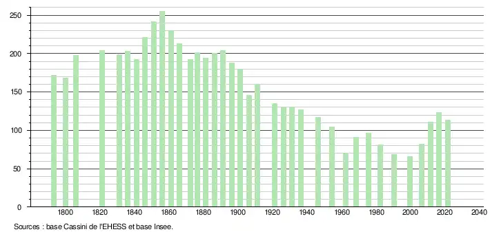 | L'évolution du nombre d'habitants est connue à travers les recensements de la population effectués dans la commune depuis 1793. Pour les communes de moins de 10 000 habitants, une enquête de recensement portant sur toute la population est réalisée tous les cinq ans, les populations légales des années intermédiaires étant quant à elles estimées par interpolation ou extrapolation[43]. Pour la commune, le premier recensement exhaustif entrant dans le cadre du nouveau dispositif a été réalisé en 2006[44]. En 2021, la commune comptait 113 habitants[Note 8], en diminution de 6,61 % par rapport à 2015 (Ariège : +1,38 %, France hors Mayotte : +1,84 %). |