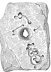 En 1886, Paul du Chatellier trouva, sous un tumulus qu'on venait de raser sur les terres du château de Men-Guen (Minven), une dalle dont la face supérieure était couverte de sculptures formant des cupules, les unes oblongues, les autres rondes, de dimensions différentes, reliées par des rigoles formant un dessin très varié ; la pierre avait un trou central[23].